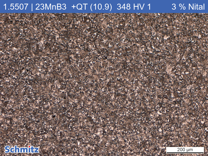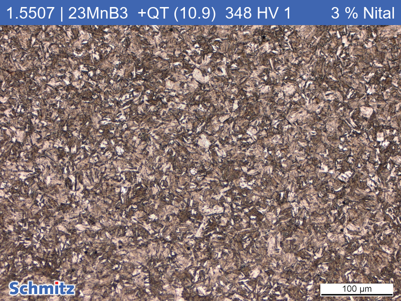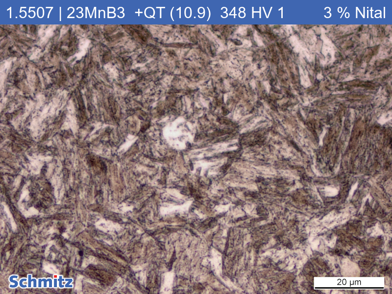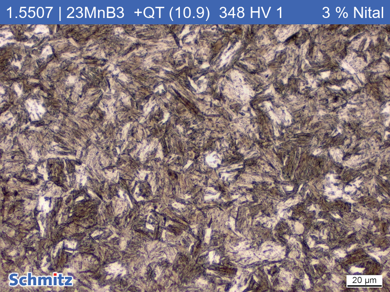 In the purely hardened state, the microstructure consists of tetragonal martensite. You can see a nice comparison of the needle structure if you compare the tetragonal martensite with the strength class 11.9.