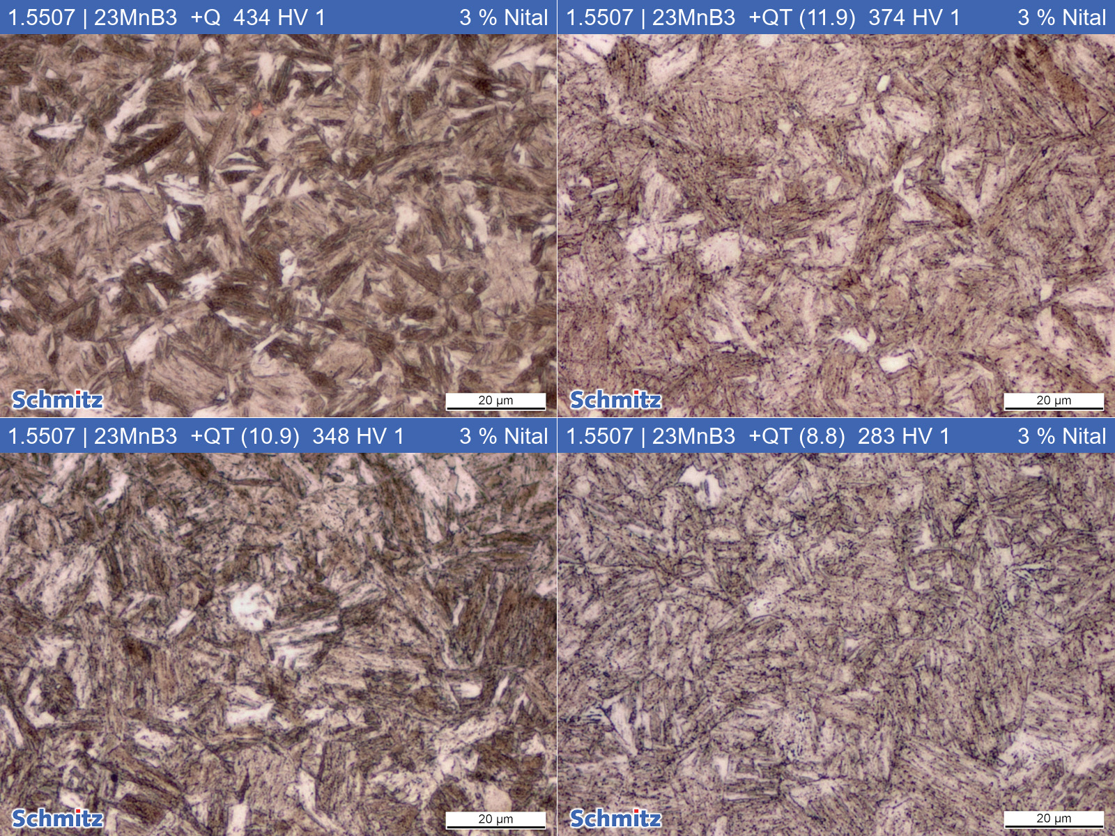 The strength class is set via the height of the tempering temperature. The higher this is, the lower the strength values. In the images taken at 1000x optical magnification, a clear difference can be seen between the individual strength classes in the proportions of fine epsilon carbides that form during tempering. The higher the tempering temperature, the more epsilon carbides can precipitate. This in turn leads to greater relaxation of the martensite, accompanied by lower strength and higher elongation values.