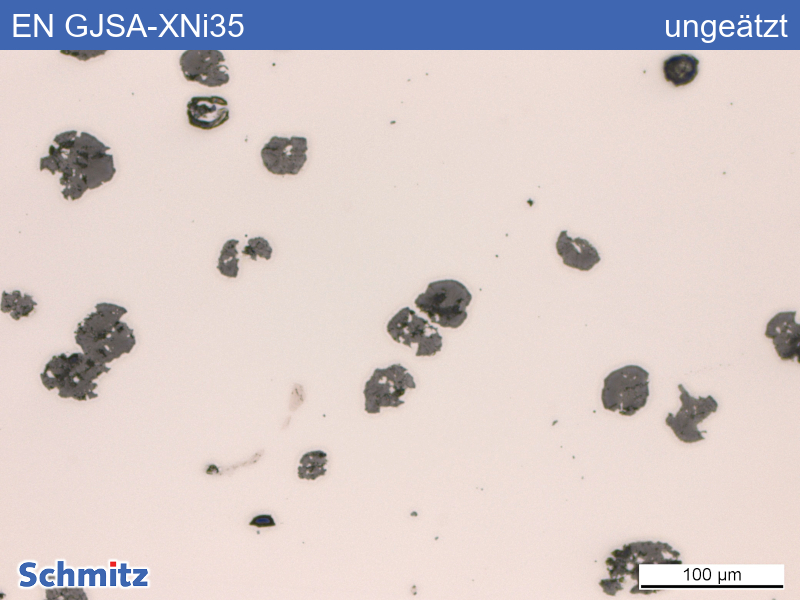 The fracture surface of the tensile specimen shows ductile fracture honeycombs in which the graphite spheres are located. The highly nickel-alloyed matrix could hardly be etched; Figure 10 shows examples of a few grain boundaries and the suggestion of a dendrite structure.