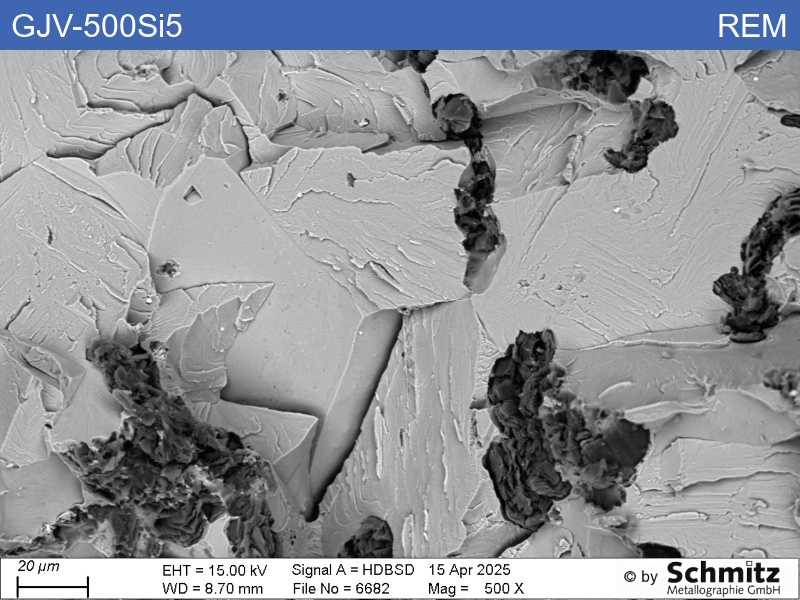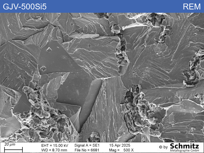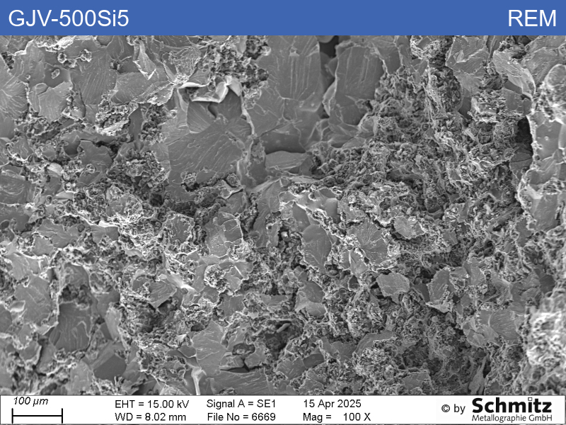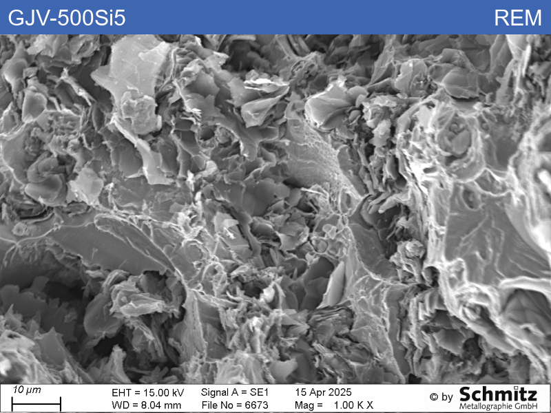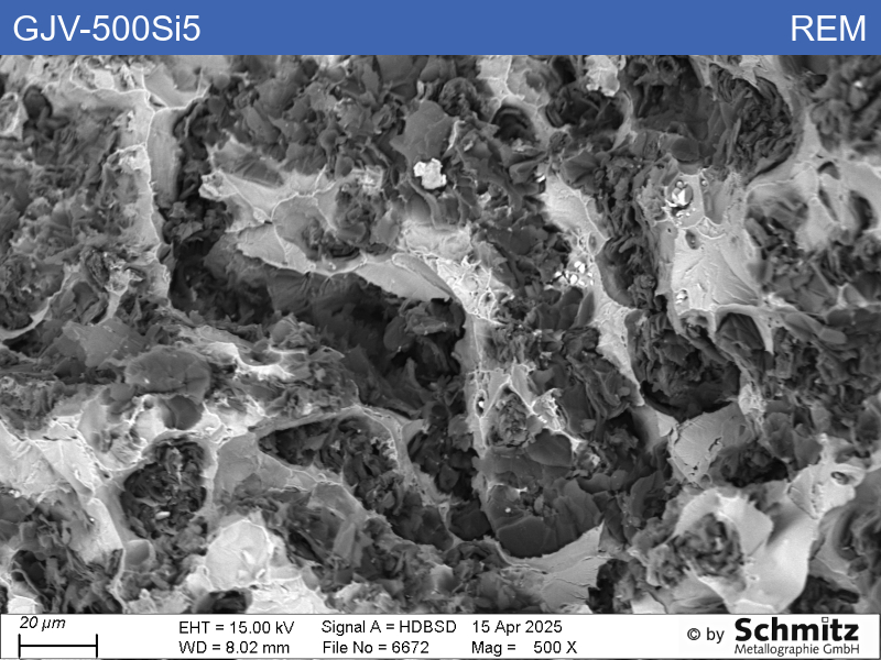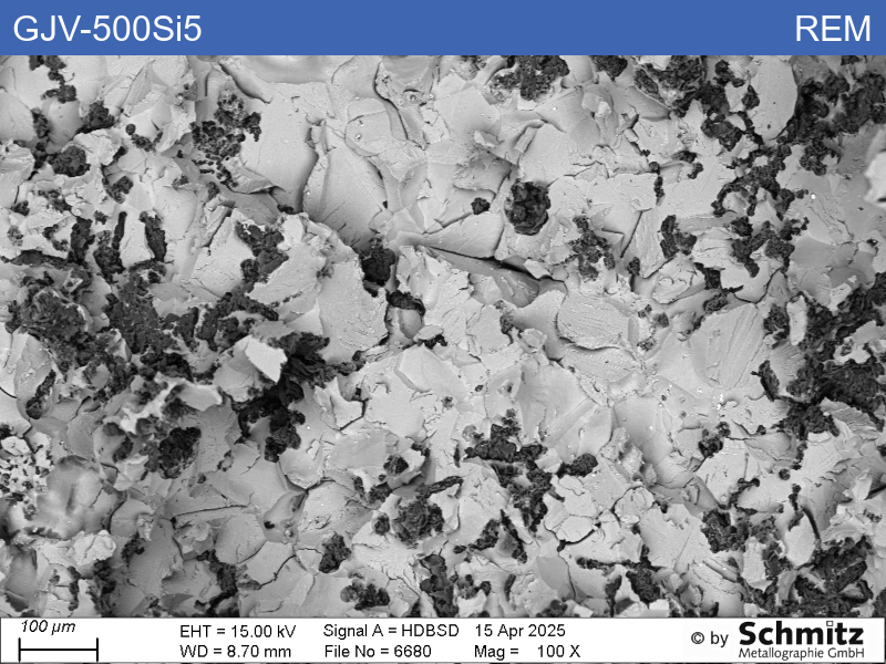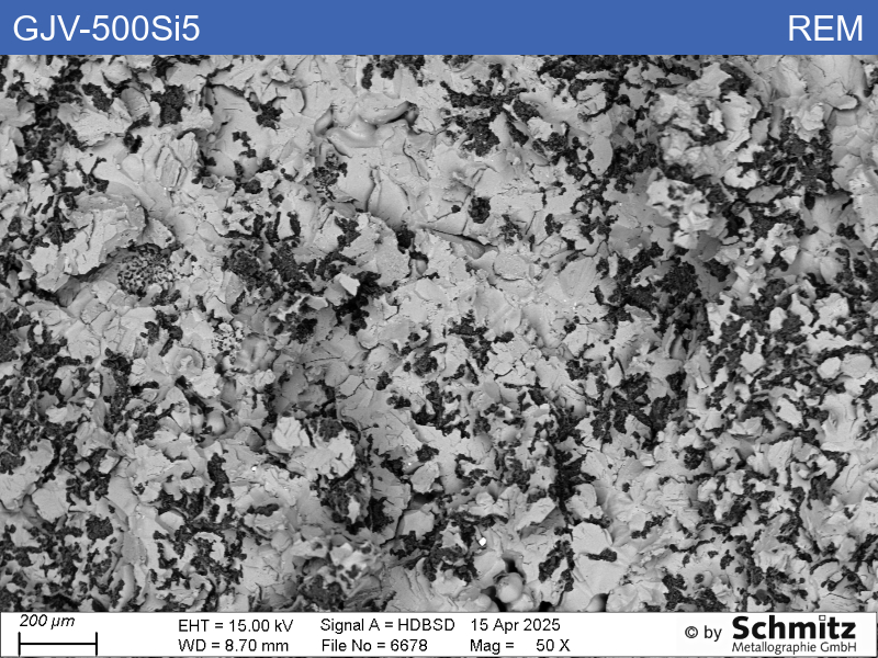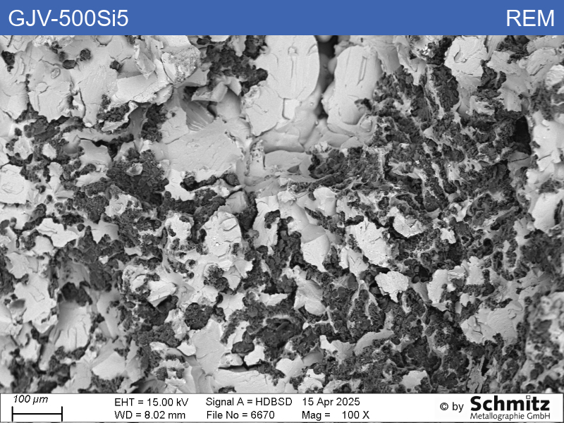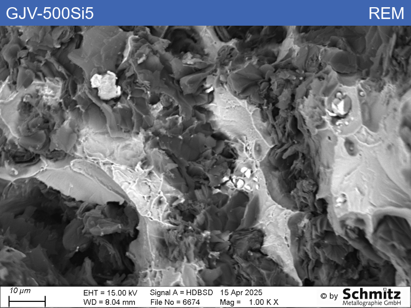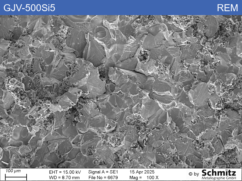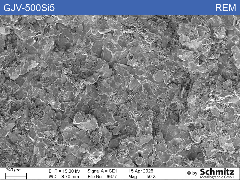 The fracture surface of the tensile specimen shows quasi-split fracture, i.e. predominantly split fracture with occasional tiny honeycomb fractures between the graphite “worms”. The matrix is purely ferritic. Tensile strength Rm = 544 MPa, Rp0.2 = 498 MPa, elongation at break A = 1.8%.
