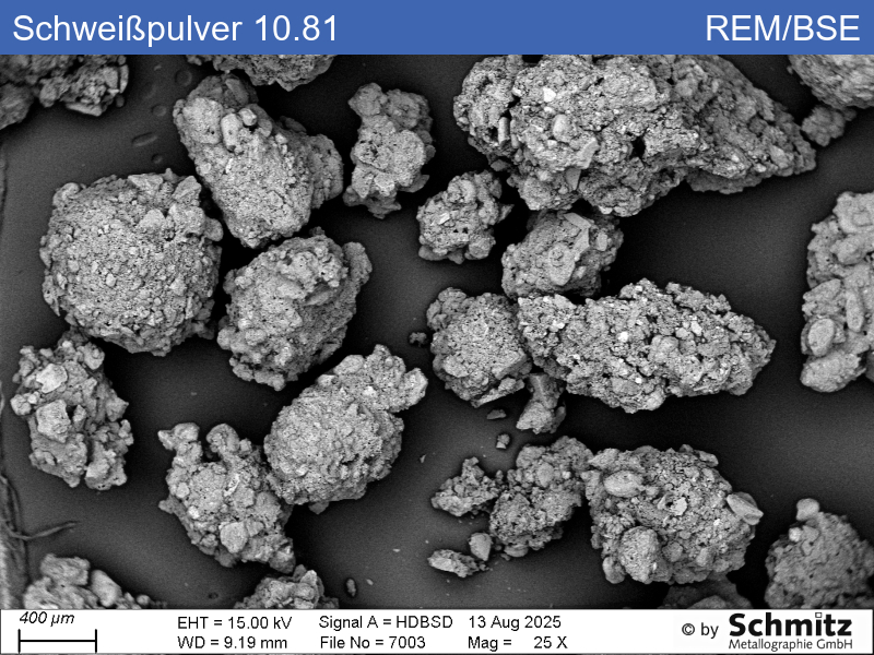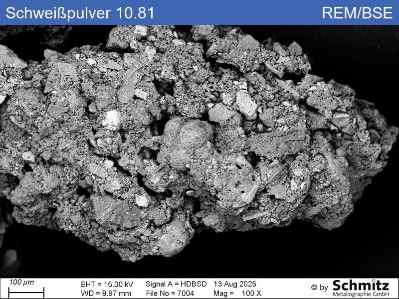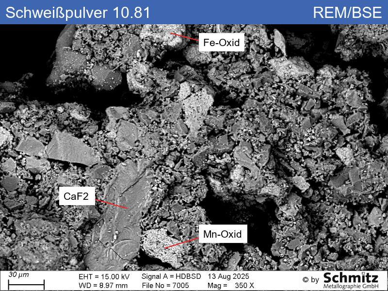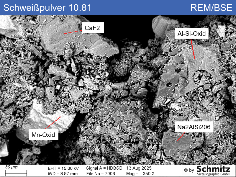 The powder melts during submerged arc welding and protects the seam from air ingress, eliminating the need for shielding gas. The agglomerated powder particles examined mainly contain Al, Mn and Si oxide. Specifically, small particles of Mn oxide, NaAlSi2O6, CaF2, TiO2, MgO, Fe oxide and SiO2 (among others) were identified.