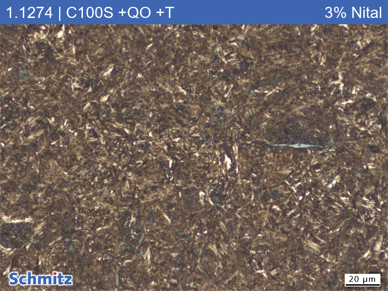 Anhand des Gefüges lassen sich die beiden Abschreckmittel nicht unterscheiden, die in Öl abgeschreckte Probe zeigt aber eine etwas höhere Härte (710 HV5 im Vergleich zu 693 HV5). Ein C100S sollte auch in Öl gehärtet werden, da Wasser eine zu schroffe Abschreckwirkung hat.
