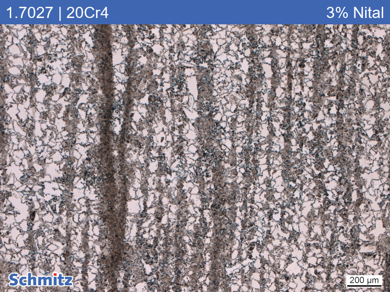 Dieser 20Cr4 wurde teilaustenitisiert und abgeschreckt. Die ehemaligen Perlitzeilen wurden durch nachfolgendes Abschrecken in Martensit umgewandelt. Teilweise erahnt man noch die ehemaligen Perlitlamellen als Substruktur. Der Rand ist ca. 400 µm Tief entkohlt.