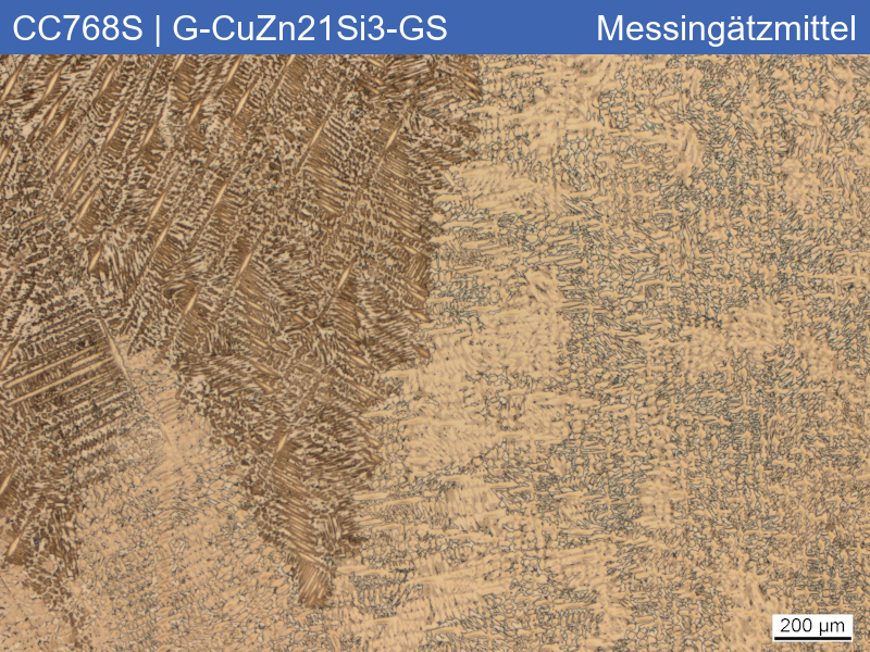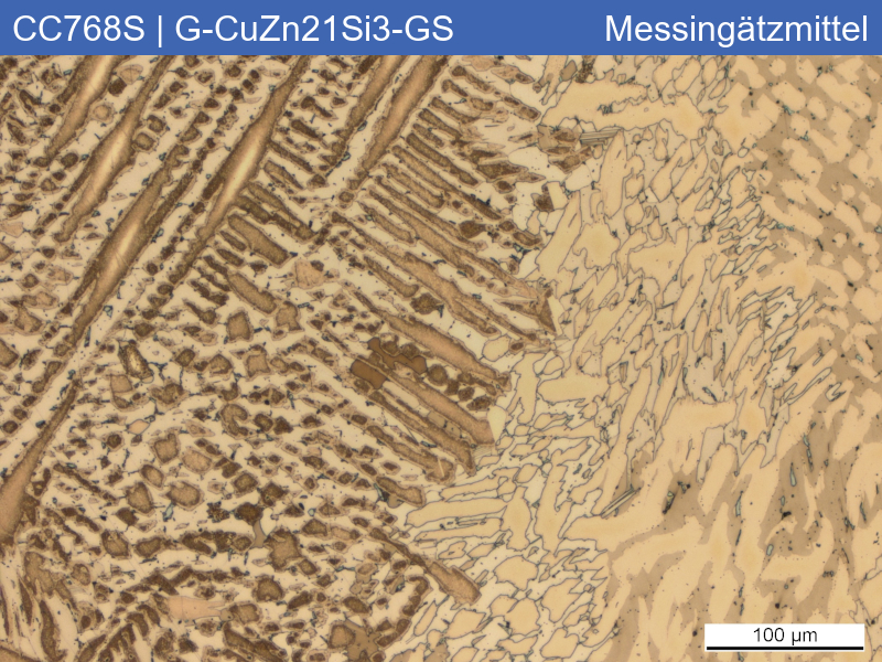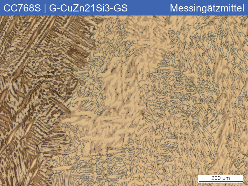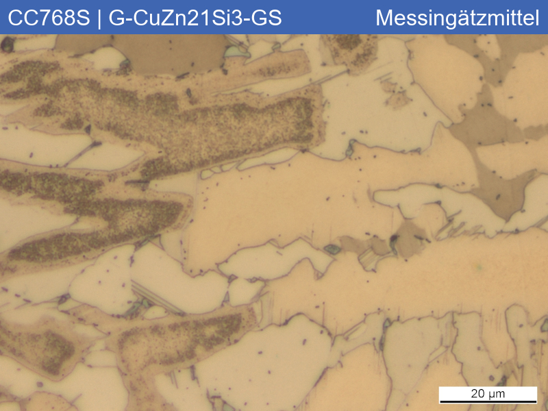 Das Gefüge besteht aus Alpha- (fcc, dunkler), Kappa- (hcp, hell) und Gamma-Phase (klein, blaugrau). Alpha enthält etwas mehr Zink und weniger Silizium als Kappa, ist dadurch unedler und wird stärker angeätzt.