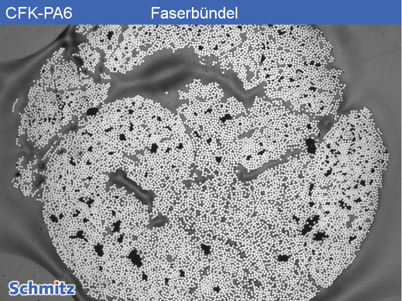 Die Aufnahmen stammen von einem Carbonfaserbündel in PA6 Matrix mit diversen Fehlstellen.