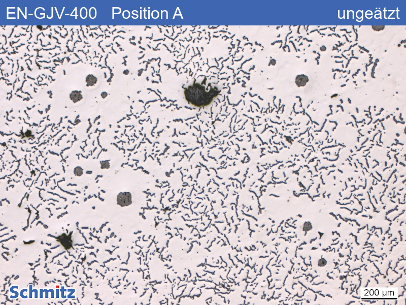 In Position B liegt der Graphit zu ca. 90 % als Vermiculargraphit (Form III) vor, zu 4 % in Kugelform (Form VI) und zu 6 % als geringfügig ungleichförmiger Kugelgraphit (Form V) vor.
